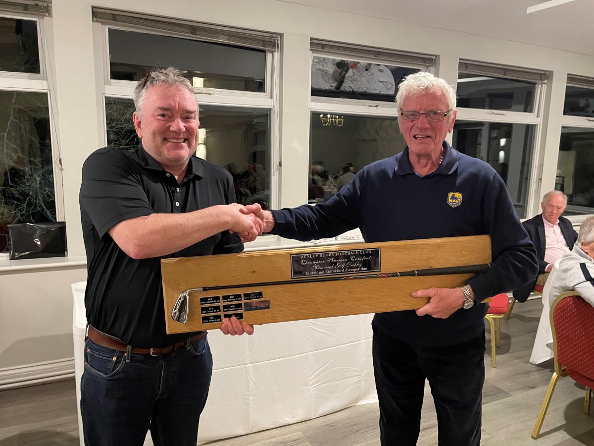 Photo of Colin being presented with the winners Christopher Sharman-Crawford Memorial trophy by Graham Horner.